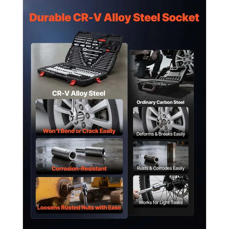 VEVOR Mechanics Tool Set, 308-Piece Mechanic Tool Kit, 1/4 in, 3/8 in, and 1/2 in Drive, SAE and Metric Socket Set, Wrenches, Screwdriver Bits, Accessories, and Storage Case, for Automotive Repair