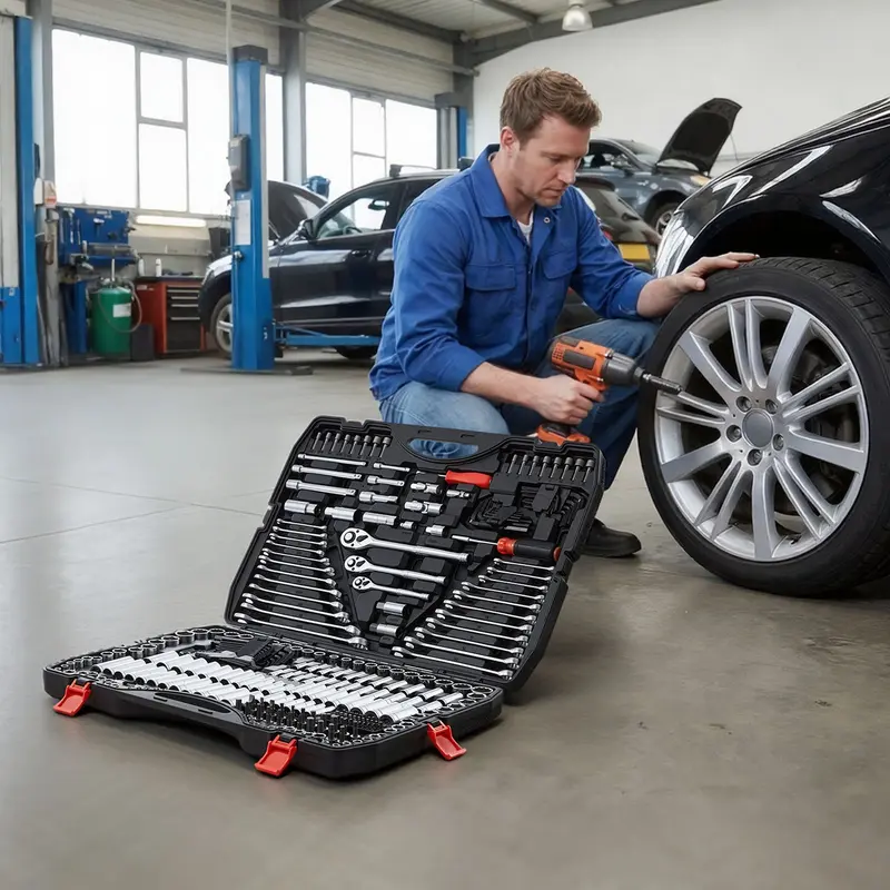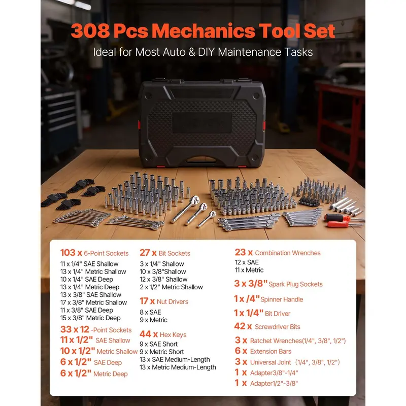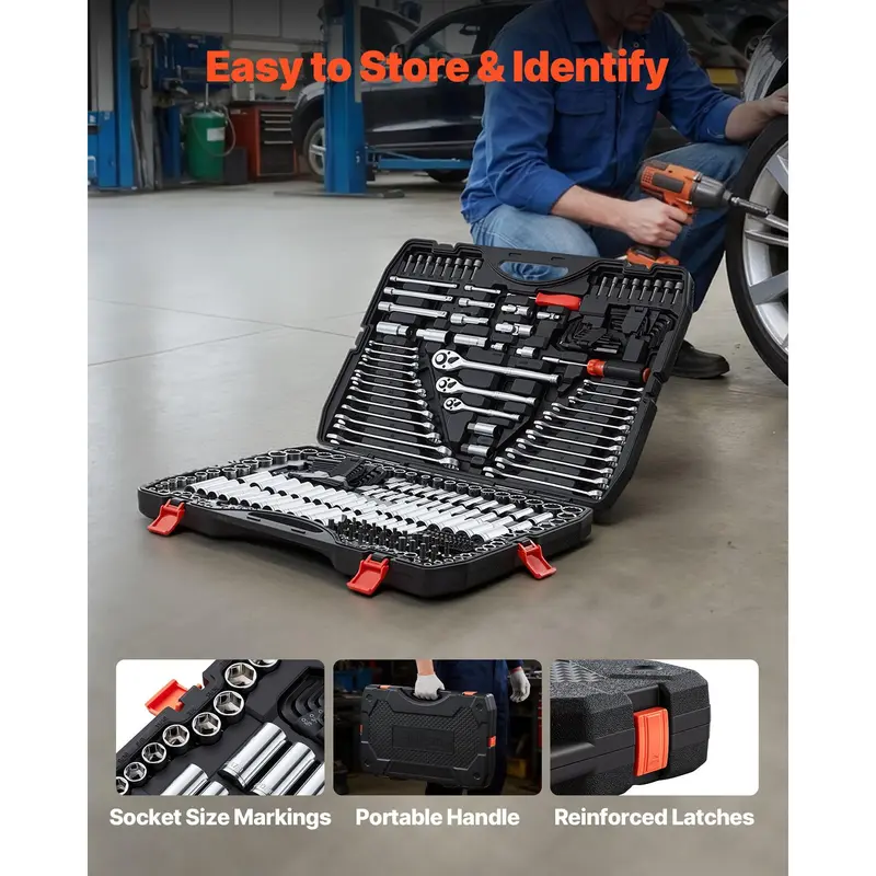 • VEVOR Mechanics Tool Set, 308-Piece Mechanic Tool Kit, 1/4 in, 3/8 in, and 1/2 in Drive, SAE and Metric Socket Set, Wrenches, Screwdriver Bits, Accessories, and Storage Case, for Automotive Repair